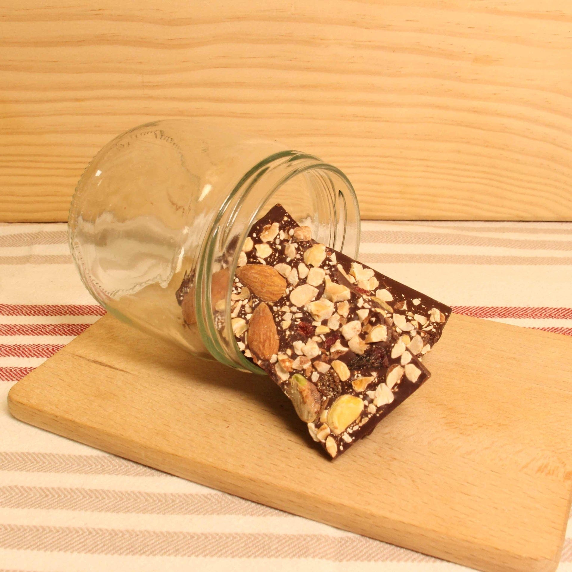 Chocolat noir (masse de cacao (Sao Tomé-et-Principe), sucre de canne non-raffiné, beurre de cacao, poudre de vanille Bourbon (Madagascar)), fruits secs et confits (10%) (AMANDES, NOISETTES (Italie), raisins secs, cranberries séchées, PISTACHES, sucre)