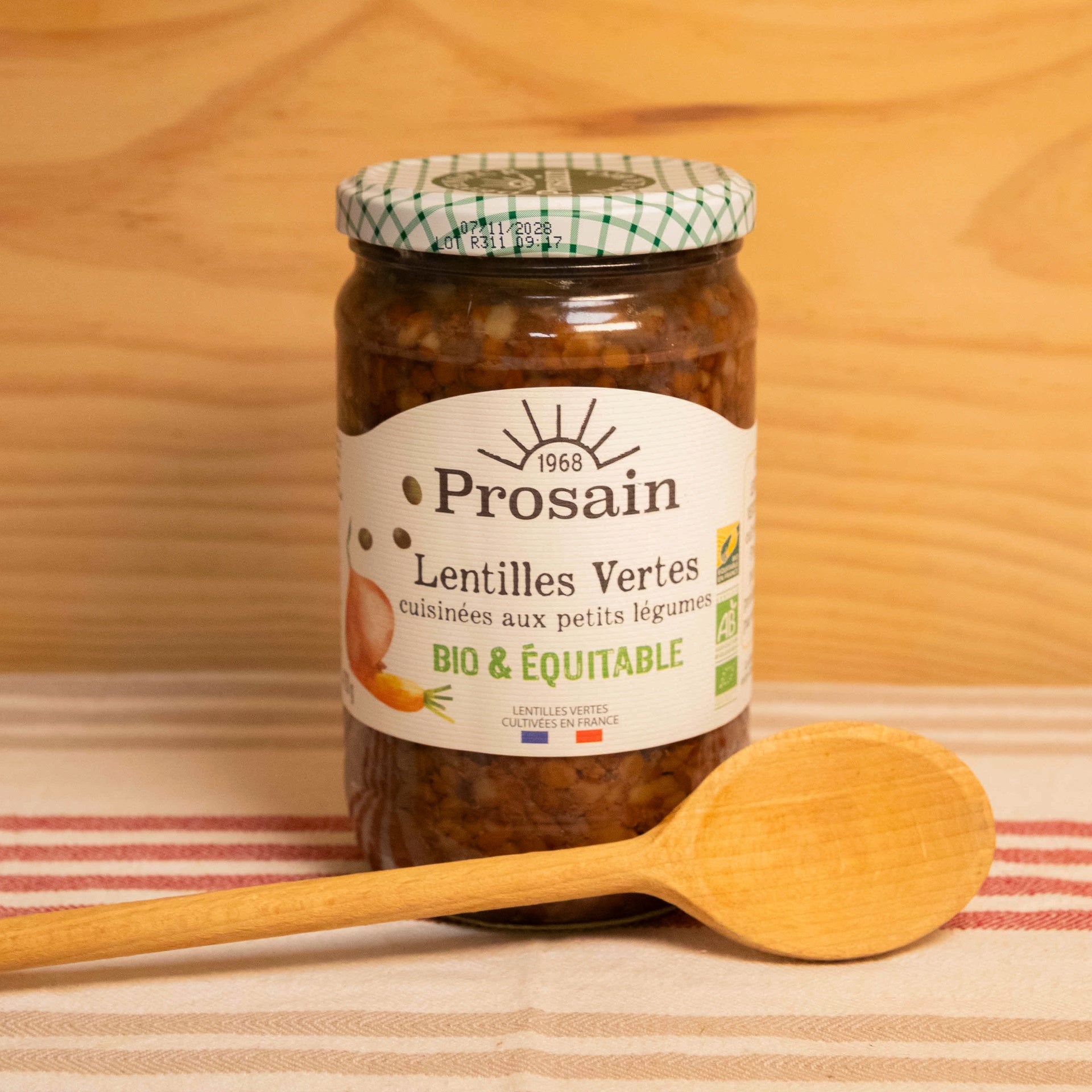 Cultivées en France en partenariat avec une coopérative bio engagée du Tarn-et-Garonne, ces lentilles vertes bio sont cuisinées avec soin dans la conserverie Prosain au cœur des Pyrénées-Orientales. Mijotées aux petits oignons et aux carottes pour un goût savoureux, elles sont cuites lentement pour offrir une texture tendre et sont prêtes à l’emploi.